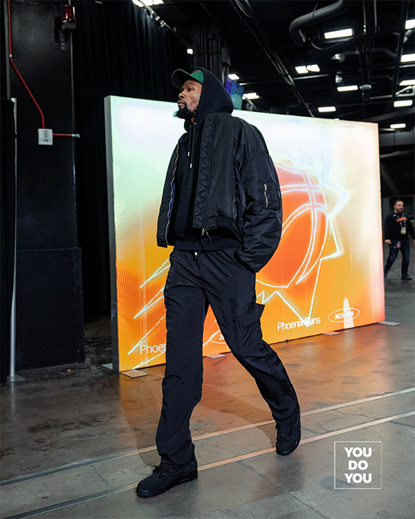 35岁的杜兰特身穿最爱的休闲装入场,身穿黑色工装裤、黑色连帽卫衣以及戴着绿色棒球帽,单手抄兜走进球馆,把杜小帅独一无二的气质展现地淋漓尽致。