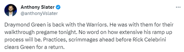 勇士记者Anthony Slater报道,追梦已经回归球队,今日追梦和全队一起进行了赛前的踩场训练;科尔接受采访时证实了格林已经归队,表示在他找回状态这段时间,格林每天都会和训练师Rick Celebrini一同训练。