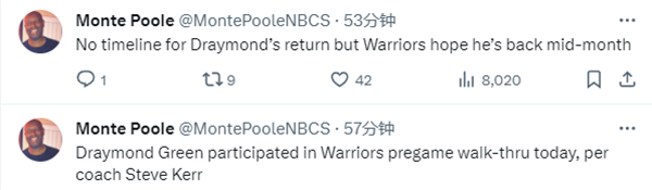 格林预计需要一周左右的恢复期,可能会在1月16日客场对阵灰熊时复出。
