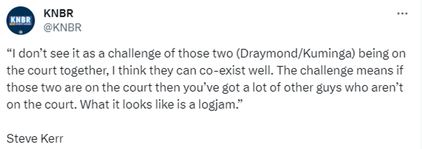 对于格林和库明加谁首发的问题,科尔表示:我并不觉得他们俩一起上场会是一个挑战,我认为他们俩可以很好地共存。挑战在于,如果他们俩同时在场上,那么很多其他家伙就上不了场了。当德雷蒙德复出后,这看起来就像是一个僵局。