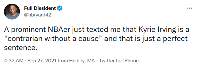 欧文的行为,已经引起球迷和媒体的热议。过去这个休赛期,他一直是话题人物。包括此前有记者称,欧文的经纪人明确表示,如果篮网交易欧文,欧文就会选择退役。昨天,还有报道称欧文关注和点赞了不少疫苗阴谋论的内容。
