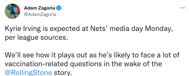 178直播9月27日讯 ,据NBA记者Adam Zagoria报道,消息人士透露,篮网球星欧文预计参加明天的媒体日。此前,欧文的姑姑Tyki曾表示,她认为欧文会在媒体日上和记者们谈谈疫苗的话题。
