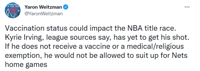 如果欧文没有接种疫苗,根据纽约当地的防疫规定,他将无法出战篮网的主场比赛。这种情况,和勇士的维金斯类似。据悉,联盟目前还有50-60名球员没有接种疫苗,但不少球队(包括湖人)在内表示,他们预计在常规赛开始前达成全队接种疫苗的目标。