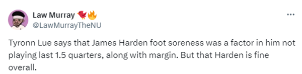 从第三节5分09秒被换下后,哈登再也没有上场,究竟卢帅为何在末节弃用哈登?赛后泰伦-卢解释,他表示哈登的右脚酸痛是他最后没有上场的原因之一,另一个原因是当时双方的分差。