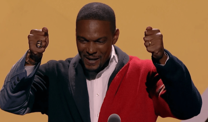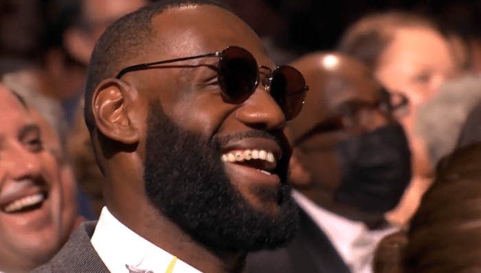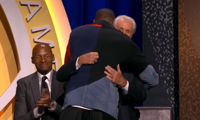 波什上台后先向观众问好,感谢帕特-莱利,并且把戒指还给莱利;演讲期间,波什又提到湖人名宿科比,镜头更是给到詹姆斯,詹姆斯戴着一副眼镜十分帅气,亲眼见证波什的荣誉时刻;度假归来的詹姆斯怎么缺席好兄弟的名人堂典礼之夜。