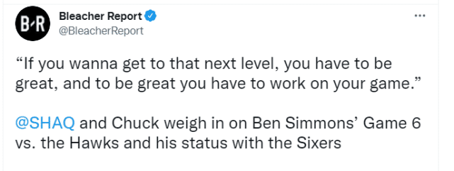 巴克利只是开了个头,奥尼尔有更多的话想对西蒙斯说。“本-西蒙斯,你没有那么好。在这个联盟,你想成为一名好球员?还是一名伟大的球员?你并不伟大,如果你想进一步成长,你就不得不让自己变得伟大。要是想变得伟大,你就必须得提升你的比赛水平。”