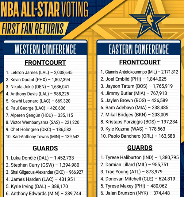 178直播01月05日讯 NBA官方公布了2024年全明星首阶段投票结果,字母哥成为票王,他的得票数为2171812票,詹姆斯成为西部票王,票数突破200万。西部的后场竞争是相当激烈的,率队处于连胜的哈登也获得外界的肯定,他以431951票,力压欧文、爱德华兹和克莱等人,排名西部后场第四,重返全明星的可能性很大。