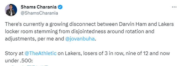 过去12场比赛中,湖人输掉了9场,这加剧了湖人内外部对本赛季前景的担忧;6位直接了解情况的消息人士表示,哈姆和湖人更衣室成员日渐脱节,这引发了人们对哈姆主帅地位的质疑。消息人士透露,哈姆和球队之间的分歧主要源于最近几场极端的轮换和首发阵容的调整,这导致多名球员状态出现波动。
