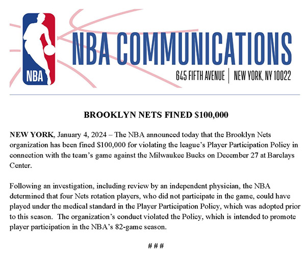 178直播01月05日讯 ,NBA官方公布一笔罚单,联盟查实篮网违反球员参赛政策,联盟对篮网开出10万美元的罚款。