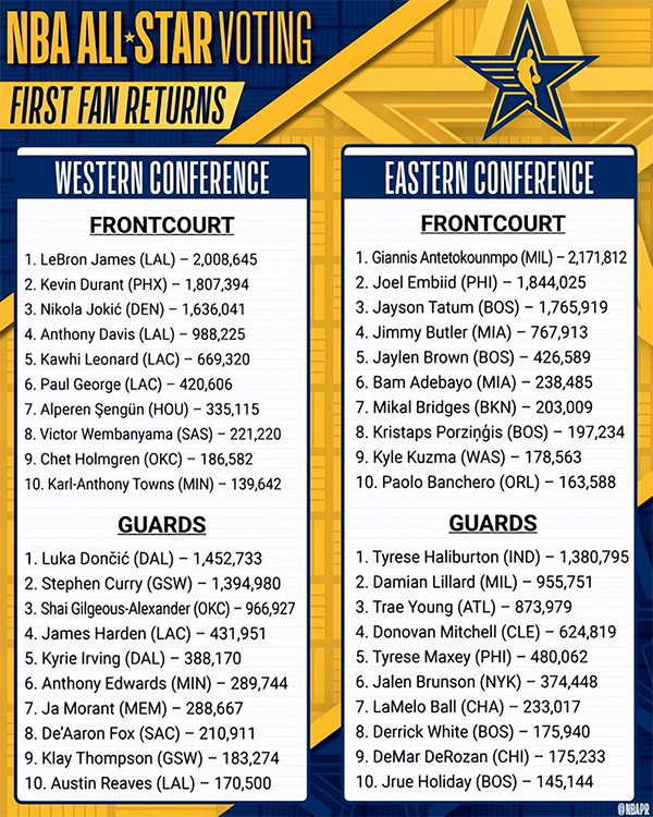 178直播01月05日讯 ,NBA官方正式公布2024年全明星首轮投票结果,字母哥2171812票暂时领跑成为票王,詹姆斯2008645票领跑西部,杜兰特西部第二。