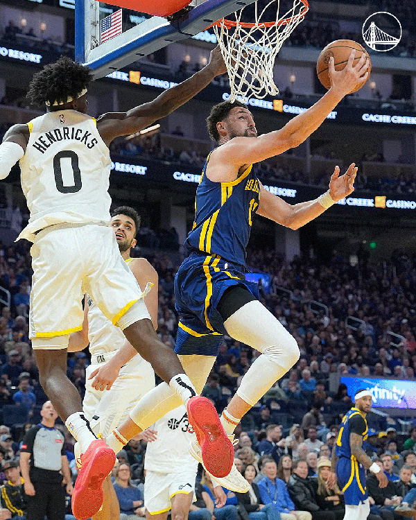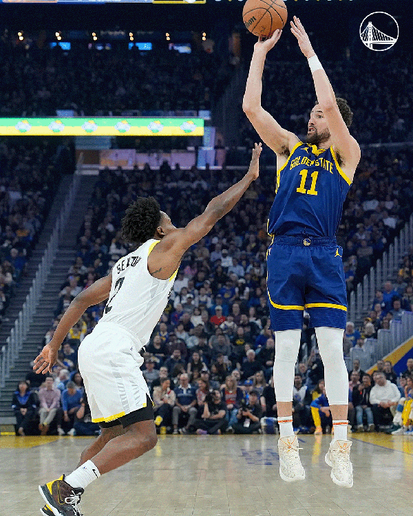 下半场,汤普森和保罗带队重新领先到20分,期间汤普森命中个人第6记三分;勇士球迷希望汤普森继续投,可惜连续两次错失三分,爵士趁机缩小分差;汤普森下场休息,穆迪、库明加和波杰助勇士稳住局面,三节打完勇士领先20分。