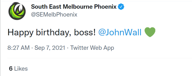 178直播9月07日讯,澳大利亚男篮联赛(NBL)球队东南墨尔本凤凰在社媒上写道:“生日快乐,老板@约翰-沃尔!”是的,这支近日传出要和周琦签约的球队,它的老板之一就是目前效力于火箭的约翰-沃尔。沃尔在2020年11月宣布购买凤凰队的部分股份,成为这支球队的小老板之一。今天是沃尔的31岁生日。