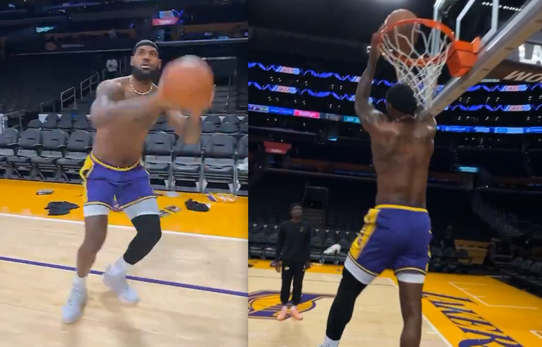 在湖人主场对阵热火赛前,詹姆斯早早入场并且来到球馆中备战本场比赛;在热身期间,老詹光着膀子完成折叠背扣,还进行中投以及三分球训练,连续命中3记底角三分,之后完成双手暴扣。