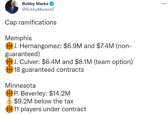 薪金专家鲍比-马克斯解析了这笔交易,灰熊得到的埃尔南戈麦斯,合同还有两年,薪金分别是690万美元和740万美元,其中第二年是无保障合同。卡尔弗的合同也剩两年,薪金分别是640万美元和810万美元,其中第二年是球队选项。森林狼得到的贝弗利,还剩一年合同,薪金是1420万美元,目前森林狼的总薪金距离奢侈税线还有920万美元,他们在合同期的球员只有11名。