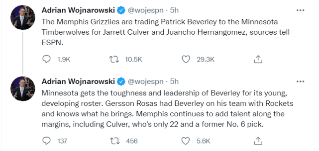 有趣的是此前贝弗利被交易到灰熊时,他第一时间喊出灰熊的口号:Grit and Grind,算是向新东家表忠心,灰熊也晒图欢迎,没想到他们竟然这么快就把贝弗利再次送走。球迷调侃贝弗利太尴尬了,但贝弗利本人应该无所谓,他转发了森林狼记者Evan Porter的报道,再次第一时间对交易发声。