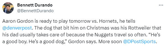 在圣诞节期间,掘金官方宣布戈登的面部和右手被狗严重咬伤,暂时离队接受治疗,名记shams报道,戈登的面部和手部总共缝了21针,戈登的离奇受伤引热议。