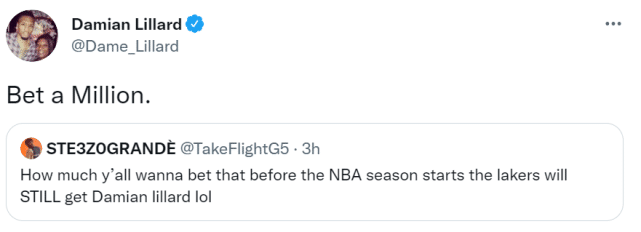 一个球迷在社媒上提问:“你们敢不敢赌湖人还会得到利拉德?”利拉德本人回应:“赌100万。”美媒解析称,利拉德加盟湖人只是停留在流言阶段,湖人确实曾经对利拉德很感兴趣,但现在他们得到利拉德的可能性是非常低的。