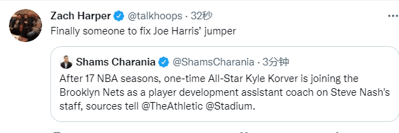 178直播讯 北京时间8月13日,据名记Shams报道,NBA17年老兵凯尔-科沃尔加盟篮网,担任球员发展助理教练从而加入纳什的教练团;对此名记Zach Harper调侃终于有人来教乔-哈里斯跳投了。