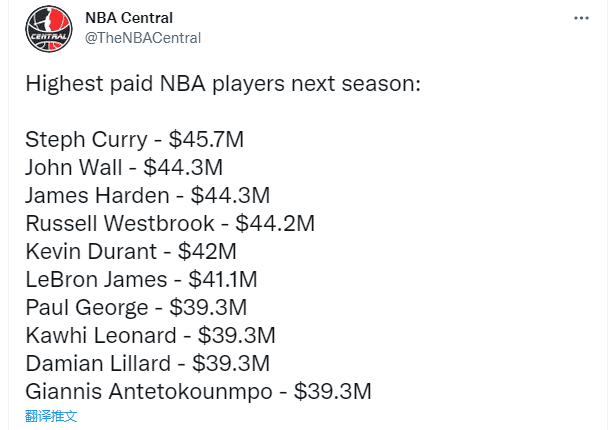 178直播讯 北京时间8月13日,美媒NBA Central晒出新赛季年薪排名前十的球星——库里4570万美元又成联盟年薪第一人;沃尔和哈登4430万美元并列第二,威少4420万美元排第四,杜兰特4200万美元排第五,詹姆斯4110万美元排第六,乔治、小卡、利拉德和字母哥3930万美元并列第七。