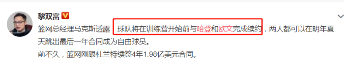 而国内篮球媒体人黎双富也确认了这一消息,他在社媒上写道,“篮网总经理马克斯透露,球队将在训练营开始前与哈登和欧文完成续约,两人都可以在明年夏天跳出最后一年合同成为自由球员。前不久,篮网刚跟杜兰特续签4年1.98亿美元合同”。