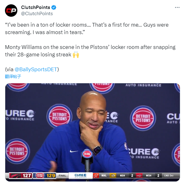 赛后蒙蒂透露活塞众将在更衣室中尖叫庆祝,更是直言:我几乎要哭了。