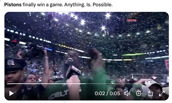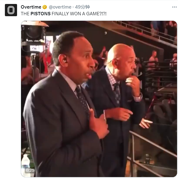 活塞终结28连败冲上推特热搜榜第一位引热议,活塞队的总冠军旗帜被恶搞P成终于赢了一场;还有球迷晒贝弗利助森林狼晋级季后赛时疯狂庆祝的画面,更有表示晒视频表示活塞终结连败就像科比、詹姆斯等人带队夺冠一样值得庆祝。