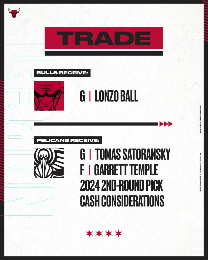 178直播讯 北京时间8月9日,公牛和鹈鹕两队关于鲍尔的大交易正式达成,芝加哥公牛官宣,把萨托兰斯基、坦普尔、2024年次轮选秀权以及部分现金送到鹈鹕,从而正式引援郎佐-鲍尔;4换1大交易完成之后,公牛晒出鲍尔身穿公牛2号球衣照,发推:欢迎鲍尔来到芝加哥。