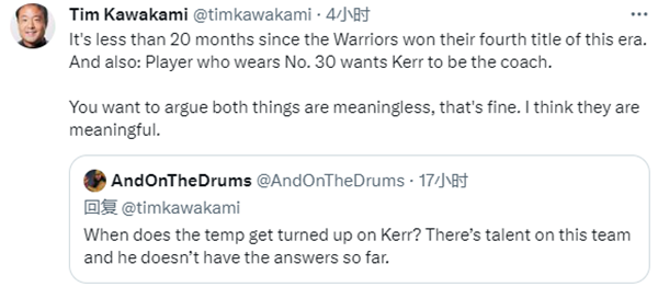 当被问及科尔与球队的续约进度,Tim Kawakami回复球迷时表示:距离这支勇士夺得第四座总冠军奖杯才过去不到20个月,此外,一位身披30号球衣的球员(库里)想让科尔当主帅。我要补充的一点是,科尔的合同将在明年7月到期,当然,如果这件事拖到最后,就会变得有些复杂。但总体而言,科尔希望至少陪伴库里度过剩下的辉煌岁月,勇士方面应该也确实希望他能留下。
