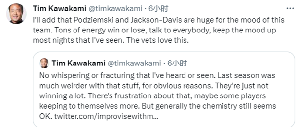 当被问及球队目前的更衣室气氛,Tim Kawakami回复道:“我没听说有任何问题,相比本赛季,由于一些大家都知道的原因,上赛季的情况显然要奇怪得多。勇士本赛季只是没有赢太多比赛,这让人有些沮丧,也许有些球员更倾向于自我调节。但总体来说,化学反应似乎还不错。”