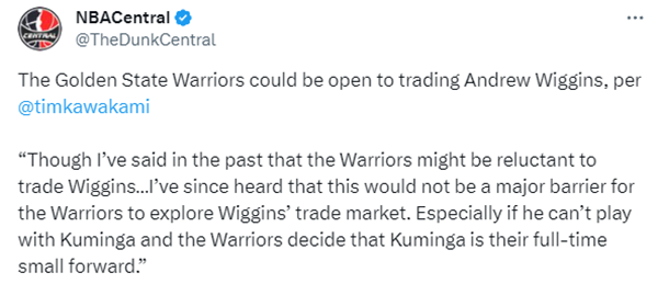 对于维金斯在勇士队的情况,Tim Kawakami表示:虽然我过去曾说过,在维金斯主动为留下而与球队签下一份相对较低的续约合同后,勇士可能不愿意那么快就把他交易出去,但现在我听说这个因素并不会成为勇士探索维金斯交易市场的障碍。尤其是如果他与库明加没法一同出场,且勇士决定让库明加成为首选小前锋时。