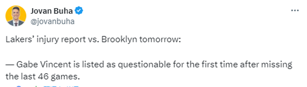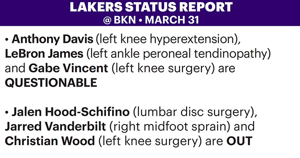 178直播讯 北京时间3月31日,湖人官方正式公布下一场对阵篮网的伤情报告,詹姆斯和浓眉都因伤出战成疑,文森特迎来复出利好,连续伤停46场后终于被列为可能出战。