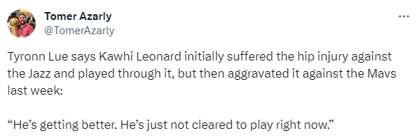 卢指导还透露小卡受伤内幕,泰伦·卢表示,小卡的臀部受伤最初是在对阵爵士时导致的,并且带伤坚持比赛,但上周对阵独行侠时,小卡的臀部伤势加剧,目前他的情况越来越好,只是还没有获准参加比赛。