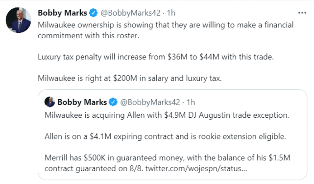 薪金专家鲍比-马克斯指出,雄鹿使用DJ-奥古斯丁的490万交易特例来得到阿伦。阿伦的年薪是410万美元,合同将在2021-22赛季后到期。雄鹿在完成这笔交易后,奢侈税由3600万美元升至4400万美元,管理层展现了愿意花钱力争卫冕的决心,他们在新赛季的年薪和奢侈税总额已经来到2亿美元。