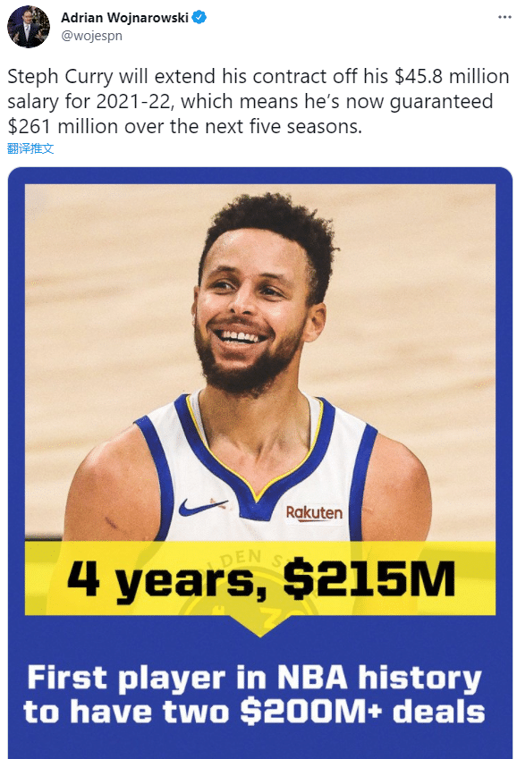 178直播讯 北京时间8月4日,据espn名记沃纳罗斯基报道,33岁的库里已经和勇士提前续约,和勇士续签2.15亿美元大合同,未来5年的合同总额高达2.61亿美元,合同将在2026年到期;库里续约勇士创纪录,成为史上首位签下两份2亿美元合同的球员。