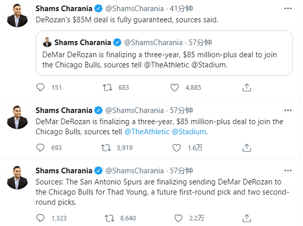 178直播讯 据名记shams报道,马刺和公牛达成先签后换的大交易,把德罗赞送到公牛,得到赛迪斯-杨、阿米奴和三个选秀权(一个未来首轮签和两个二轮签);德罗赞和公牛的合同是全额保障的3年8500万美元。