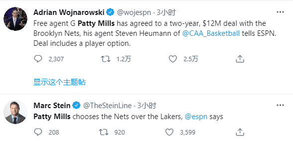 名记Marc Stein报道,米尔斯在湖人和篮网之间选择了篮网,篮网赢得米尔斯争夺战;相当于米尔斯拒绝湖人并且离开马刺,最终选择加盟篮网,新赛季助杜兰特、哈登和欧文三巨头冲击总冠军。