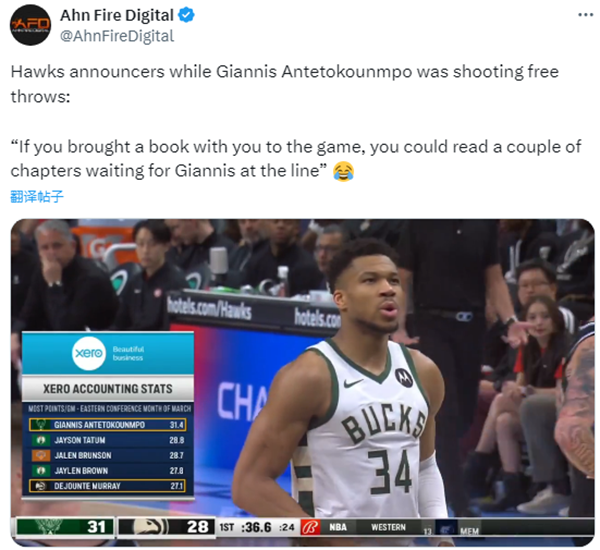 上半场字母哥因罚球时间太长被嘲讽,老鹰现场播音员表示:如果你带着一本书来看比赛,你们可以在等着字母哥罚球时阅读几章。