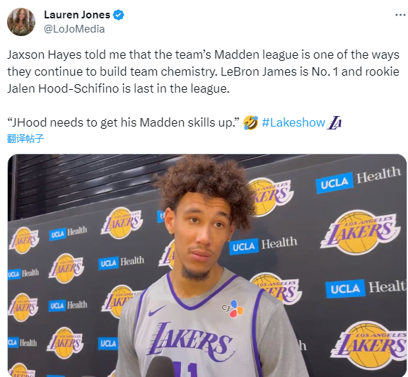 全队训练之后,海斯透露詹姆斯是湖人队玩橄榄球游戏最好的;对于湖人身处困境,海斯透露他们通过一个群聊保持紧密的联系和积极态度,表示:我们有一个《Madden》(一款NFL模拟游戏)的群聊,我们一群人都在玩。”海斯说道,“勒布朗是我们中最厉害的,但我就快追上他了。J-胡德(席菲诺)是最菜的哈哈哈。