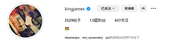 目前老詹拥有1.5亿的Ins粉丝,是全联盟最受关注的超级巨星。