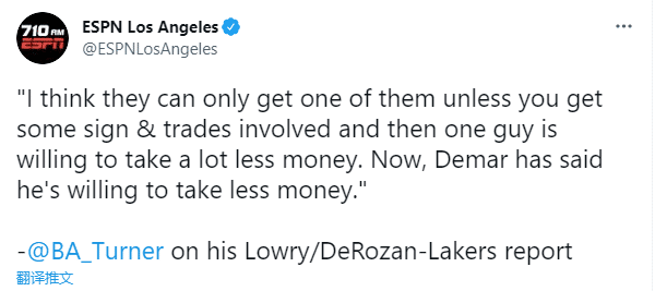 据洛杉矶时报记者Brad Turner报道,德罗赞和洛瑞都有意加盟湖人,为了回到家乡打球,德罗赞甚至愿意降薪,愿意拿比上赛季薪水(2770万美元)还低的年薪。