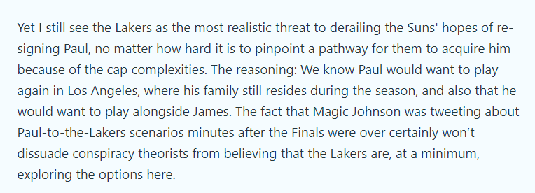 据名记Marc Stein报道,虽然湖人薪资空间有限,但湖人仍旧是是太阳续约保罗的最大威胁,理由有两点,一个是保罗太想回洛杉矶打球,他的家人都在洛杉矶生活,另一个是他想和詹姆斯一起打球;另外湖人和多名老将控卫传出流言似乎预示着施罗德并不在佩林卡的未来计划当中。