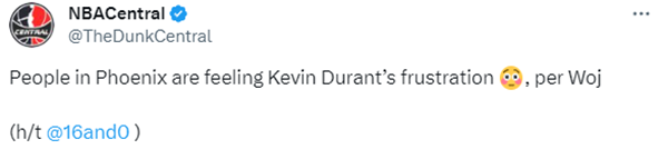 名记Woj在节目中表示,太阳的人员都能感受到杜兰特的沮丧,杜兰特对缺少帮助以及球队的阵容搭配感到沮丧,因为比尔一直在伤缺,太阳为拿到比尔已经放弃了太多,他们没有交易筹码,也没有选秀权,没有补强的手段,而太阳的夺冠窗口很短,他们必须得赢得成果,还得尽快才行。