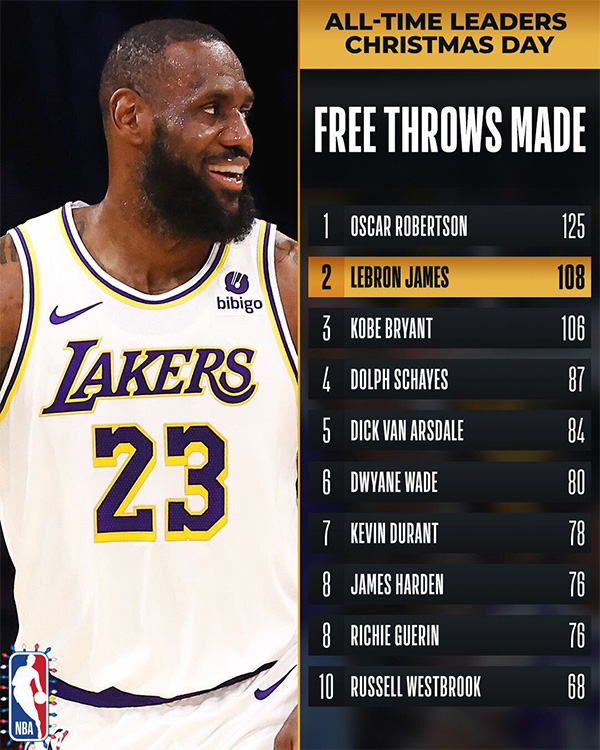 4、詹姆斯年终大战罚球命中数超越科比,升到历史第二位