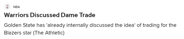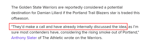 178直播讯 北京时间7月13日,据The Athletic的勇士记者安东尼-斯雷特报道,勇士已经在内部讨论了交易利拉德的想法,并会给开拓者打电话。斯雷特表示,考虑到利拉德目前在开拓者的现状,大部分球队都会这么做。The Athletic还报道称,预计多支球队会询价利拉德。如果利拉德可以被交易,除了勇士,费城、尼克斯、猛龙这三队也有实力给出不错的报价,成为主要竞争者。