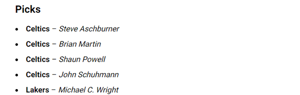 NBA官网预测战果——总共5人投票,4人认为凯尔特人获胜,1人认为湖人获胜,相当于凯尔特人获得80%的赢球支持率,湖人仅有20%。