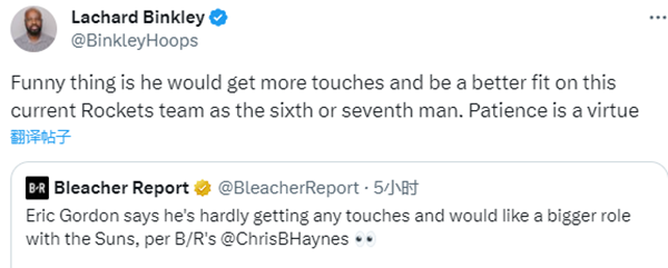 戈登抱怨球权不足以及不满球队最近11战8负,火箭记者Lachard Binkley转发报道并且发推写道:有趣的部分是,戈登更适合现在的火箭,他会在这里得到更多的触球机会,成为球队的第六或者第七人。所以说,耐心也是一个优点。