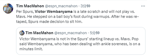 178直播12月24日讯 ,在马刺对阵独行侠赛前,马刺状元文班亚马遭遇杜兰特式悲剧,赛前热身时踩到了球童从而扭伤了此前受伤的右脚踝,因伤临时退出比赛,文班表示自己想要继续出战,但马刺方面出于谨慎考虑,没有让其继续出战。