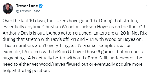 湖人记者Trevor Lane总结了近期球队内线出战/离场时的正负值,发推写道:“过去10天,湖人的战绩为1胜5负,在这段时间里,基本上只要伍德、海斯出场或戴维斯离场,湖人就会被碾压。在戴维斯离场时,湖人的净胜分为-20,伍德和海斯出场时的净胜分分别为-11和-11.1。”