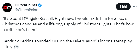 名嘴帕金斯发声希望拉塞尔离开湖人,他表示:关于拉塞尔,我愿意用他换一盒圣诞蜡烛和一个圣诞彩灯。他表现糟糕得可怕,12月份场均只能得到8.7分,这不是一个能够分担得分压力的球员的表现,湖人需要得分,看看拉塞尔,他太不稳定了。