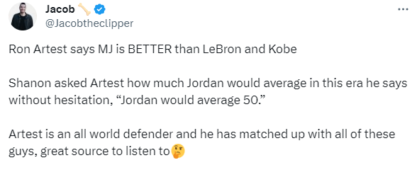 乔丹是NBA历史上最伟大的传奇巨星之一,外界经常称其为GOAT(历史最佳);若60岁的乔丹在当今联盟打打球,他能得到多少分?湖人名宿阿泰斯特曾表示乔丹比詹姆斯和科比更强,在这个时代,乔丹场均能够拿到50分。